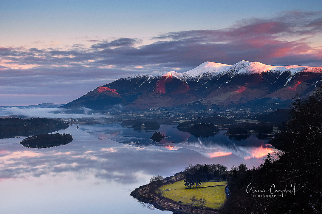This is the sun rising over Skiddaw, Blencathra, Derwent Water and the town of Keswick. Bassenthwaite Lake is usually visable from here too but it's masked by the fog bank on the left.