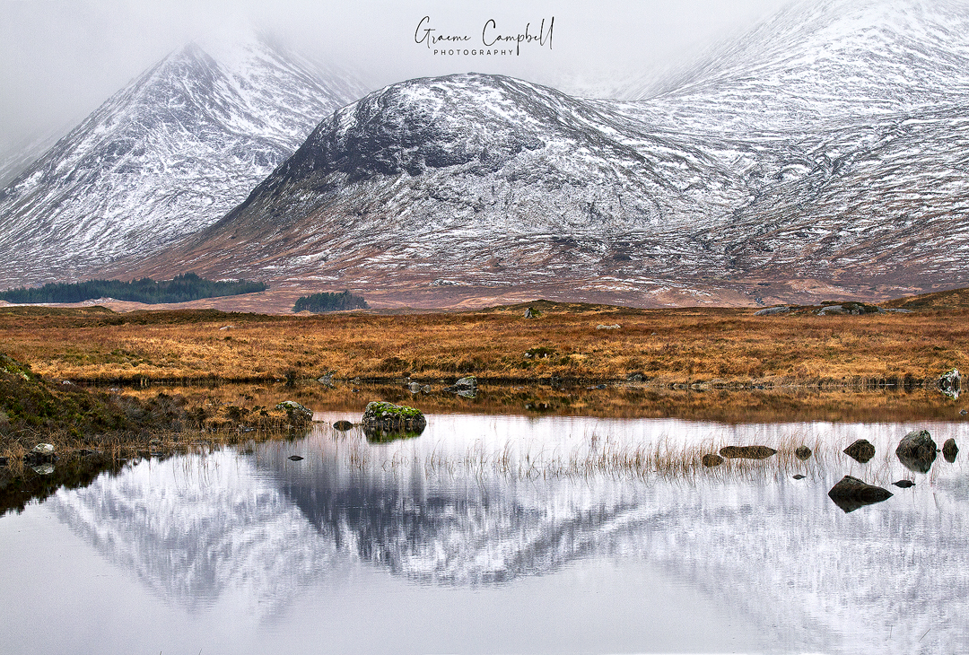 A reflected Creag an Fhirich in a still Lochan na Stainge. Rain and snow clouds are coming in quickly over the mountains.