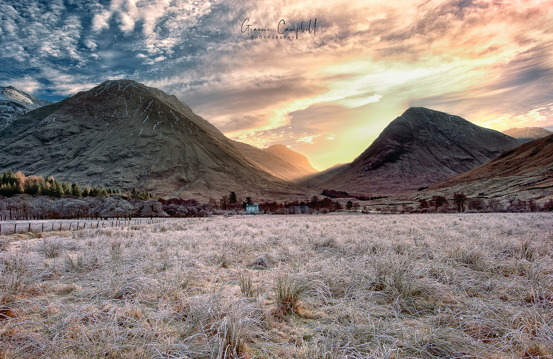 A cold and frosty daybreak through the gap between Sgorr nam Fiannaidh and Aonach Dubh. It was a spectacular sight and a nice reward to wandering though frost laden fields and doing a bit of barbed wire dodging! ðŸ˜