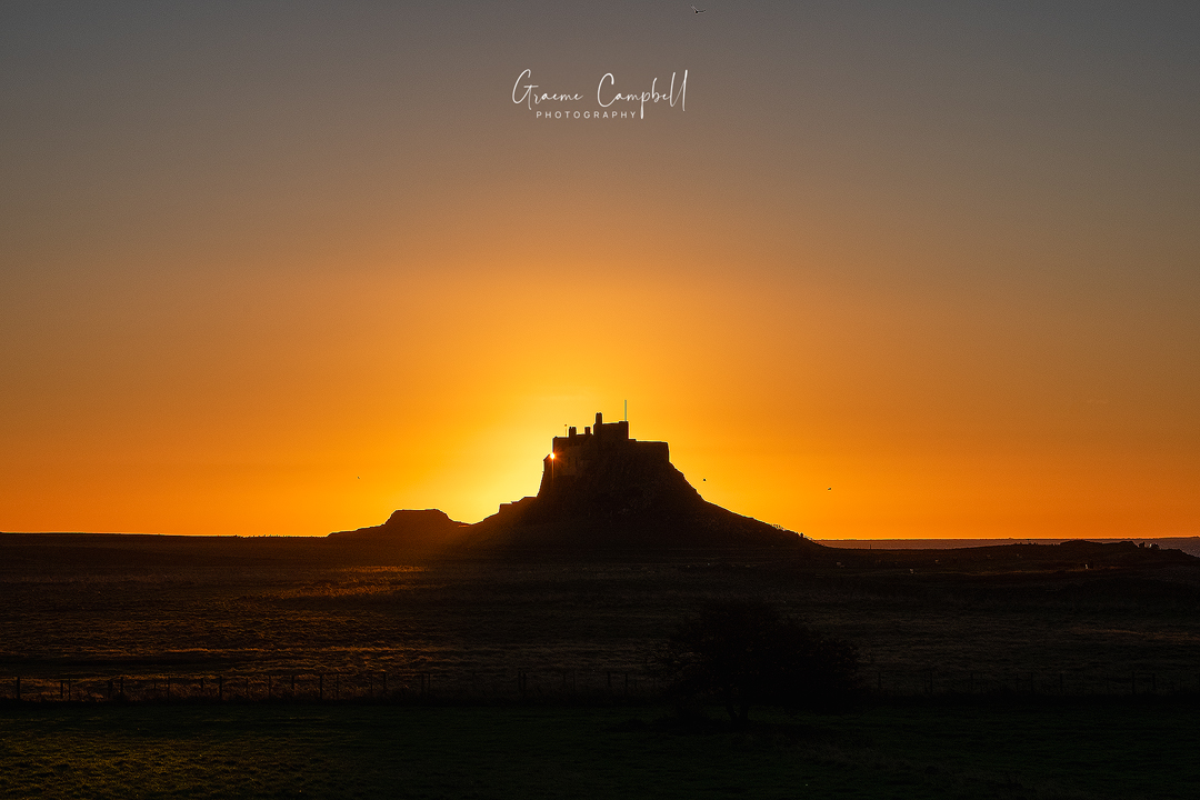 The sun rising behind Lindisfarne Castle on Holy Island in Northumberland.